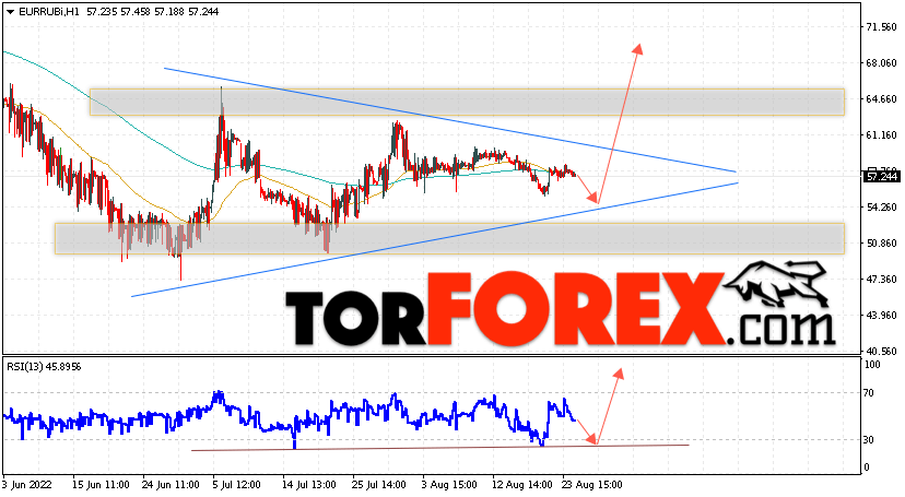 Дополнительным сигнальном в пользу роста валютной пары EUR/RUB на Форекс выступит тест линии линии поддержки на индикаторе относительной силы (RSI). Вторым сигналом станет отскок от нижней границы модели ”Треугольник”. Отменой варианта подъёма валютной пары EUR/RUB на Форекс 26 августа 2022 станет падение и пробой уровня 50.25 Евро за Рубль. Это укажет на пробой области поддержки и продолжение падения пары Евро Рубль в область ниже уровня 46.75. Подтверждением росту валютной пары выступит пробой области сопротивления и закрытие котировок инструмента выше уровня 61.75, что укажет на пробой верхней границы модели ”Треугольник” и начало отработки паттерна с целями вверху.