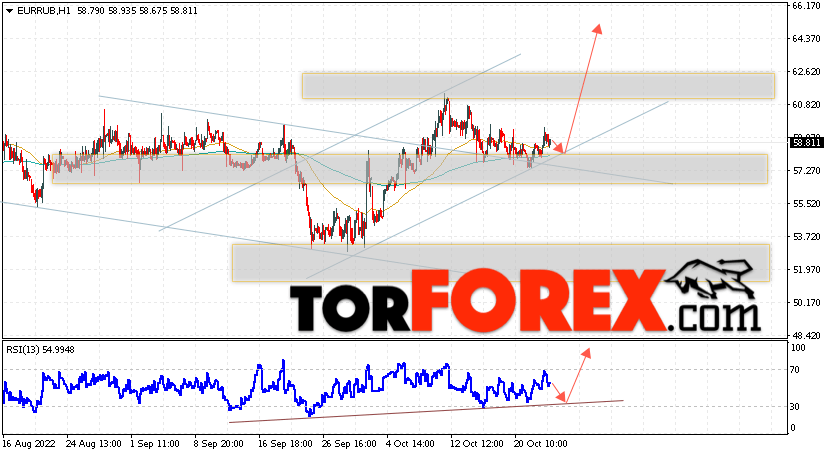 Дополнительным сигнальном в пользу подъёма валютной пары EUR/RUB на Форекс выступит тест линии линии поддержки на индикаторе относительной силы (RSI). Вторым сигналом станет отскок от верхней границы пробитого канала. Отменой варианта роста валютной пары EUR/RUB на Форекс 26 октября 2022 станет падение и пробой уровня 55.95 Евро за Рубль. Это укажет на пробой области поддержки и продолжение снижения пары Евро Рубль в область ниже уровня 52.65. Подтверждением росту валютной пары выступит пробой области сопротивления и закрытие котировок инструмента выше уровня 61.25.