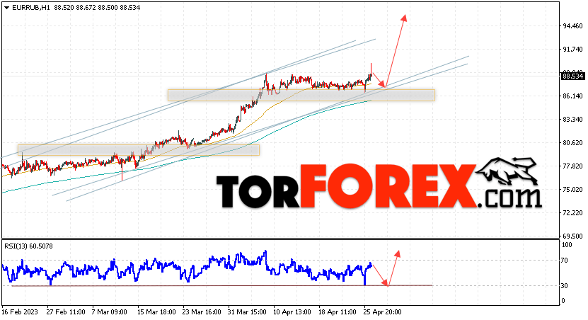 Дополнительным сигнальном в пользу подъёма валютной пары EUR/RUB на Форекс выступит тест линии линии поддержки на индикаторе относительной силы (RSI). Вторым сигналом станет отскок от нижней границы бычьего канала. Отменой варианта роста валютной пары EUR/RUB на Форекс 27 апреля 2023 станет падение и пробой уровня 85.35 Евро за Рубль. Это укажет на пробой области поддержки и продолжение снижения пары Евро Рубль в область ниже уровня 81.75. Подтверждением росту валютной пары выступит пробой области сопротивления и закрытие котировок инструмента выше уровня 91.65