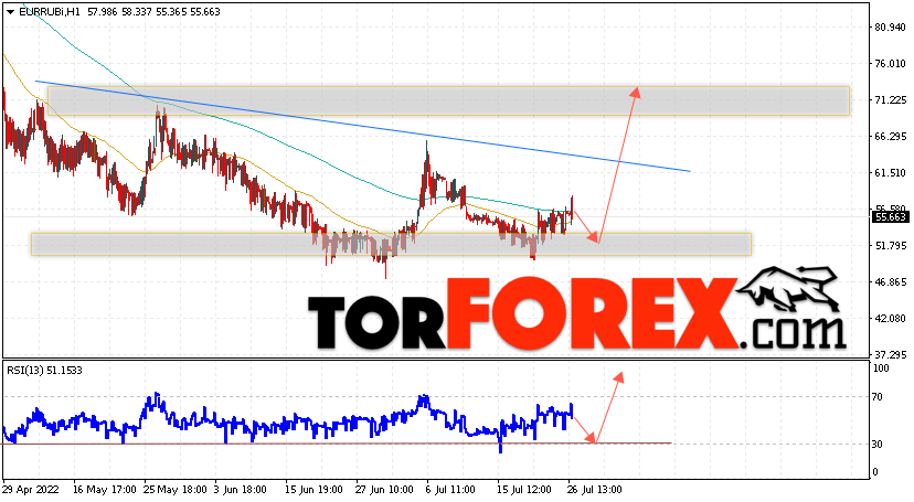 Дополнительным сигнальном в пользу роста валютной пары EUR/RUB на Форекс выступит тест линии линии поддержки на индикаторе относительной силы (RSI). Вторым сигналом станет отскок от нижней границы разворотной модели ”Голова и плечи”. Отменой варианта подъёма валютной пары EUR/RUB на Форекс 27 июля 2022 станет падение и пробой уровня 46.45 Евро за Рубль. Это укажет на пробой области поддержки и продолжение падения пары Евро Рубль в область ниже уровня 40.35. Подтверждением росту валютной пары выступит пробой области сопротивления и закрытие котировок инструмента выше уровня 67.05, что укажет на завершение формирования разворотной модели ”Голова и плечи” и начало отработки паттерна.