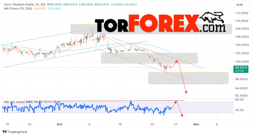 Дополнительным сигнальном в пользу падения валютной пары EUR/RUB на Форекс выступит тест линии линии сопротивления на индикаторе относительной силы (RSI). Вторым сигналом станет отскок от верхней границы медвежьего канала. Отменой варианта падения валютной пары EUR/RUB на Форекс 27 октября 2023 станет сильный рост и пробой уровня 102.45 Евро за Рубль. Это укажет на пробой области поддержки и продолжение падения пары Евро Рубль в область выше уровня 105.85. Подтверждением падению валютной пары выступит пробой области поддержки и закрытие котировок инструмента ниже уровня 96.45.