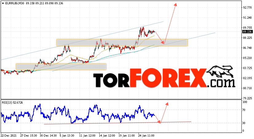 Дополнительным сигнальном в пользу подъёма валютной пары EUR/RUB на Форекс выступит тест линии тренда на индикаторе относительной силы (RSI). Вторым сигналом станет отскок от нижней границы бычьего канала. Отменой варианта роста валютной пары EUR/RUB на Форекс 27 января 2022 станет падение и пробой уровня 85.35 Евро за Рубль. Это укажет на пробой области поддержки и продолжение падения пары Евро Рубль в область ниже уровня 83.15. Подтверждением подъёма валютной пары выступит пробой области сопротивления и закрытие котировок инструмента над уровнем 90.65, что укажет на пробой верхней границы бычьего канала, а это сильный сигнал к покупкам актива. В этом случае не стоит исключать еще одну волна роста на высоту канала.