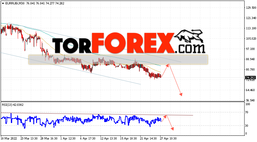 Дополнительным сигнальном в пользу падения валютной пары EUR/RUB на Форекс выступит тест линии сопротивления на индикаторе относительной силы (RSI). Вторым сигналом станет отскок от верхней границы медвежьего канала. Отменой варианта падения валютной пары EUR/RUB на Форекс 28 апреля 2022 станет сильный рост и пробой уровня 95.05 Евро за Рубль. Это укажет на пробой области сопротивления и продолжение роста пары Евро Рубль в область выше уровня 105.00. Подтверждением падению валютной пары выступит пробой области поддержки и закрытие котировок инструмента под уровнем 72.55.