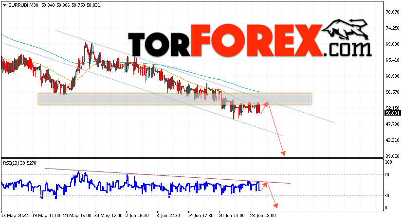 Дополнительным сигнальном в пользу падения валютной пары EUR/RUB на Форекс выступит тест линии линии сопротивления на индикаторе относительной силы (RSI). Вторым сигналом станет отскок от верхней границы медвежьего канала. Отменой варианта падения валютной пары EUR/RUB на Форекс 28 июня 2022 станет сильный рост и пробой уровня 59.55 Евро за Рубль. Это укажет на пробой области сопротивления и продолжение подъёма пары Евро Рубль в область выше уровня 63.85. Подтверждением падению валютной пары выступит пробой области поддержки и закрытие котировок инструмента ниже уровня 46.65.