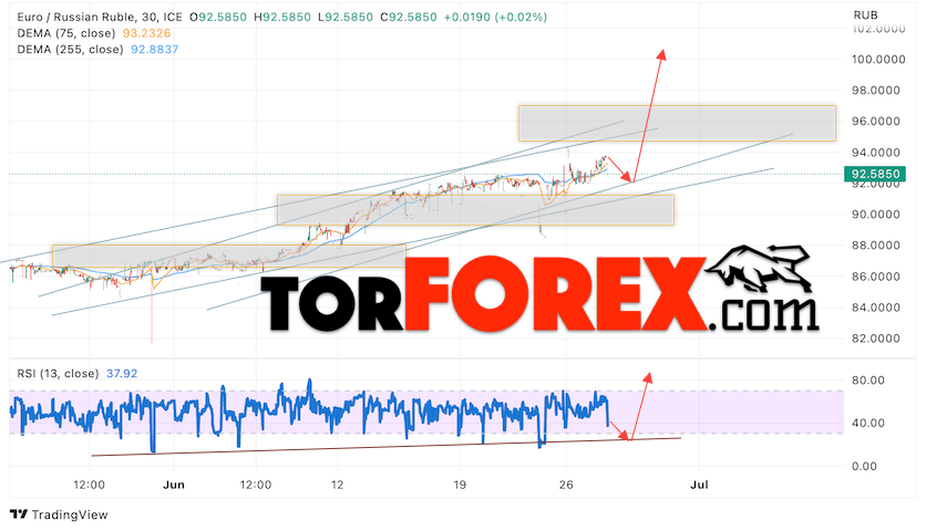 Дополнительным сигнальном в пользу подъёма валютной пары EUR/RUB на Форекс выступит тест линии линии поддержки на индикаторе относительной силы (RSI). Вторым сигналом станет отскок от нижней границы бычьего канала. Отменой варианта роста валютной пары EUR/RUB на Форекс 28 июня 2023 станет падение и пробой уровня 89.05 Евро за Рубль. Это укажет на пробой области поддержки и продолжение падения пары Евро Рубль в область ниже уровня 85.65. Подтверждением росту валютной пары выступит пробой области сопротивления и закрытие котировок инструмента выше уровня 96.05, что укажет на пробой верхней границы бычьего канала, а это сигнал к росту на ширину канала.