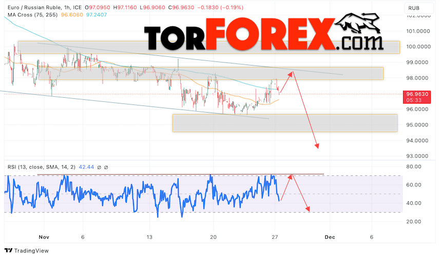Дополнительным сигнальном в пользу падения валютной пары EUR/RUB на Форекс выступит тест линии линии сопротивления на индикаторе относительной силы (RSI). Вторым сигналом станет отскок от верхней границы нисходящего канала. Отменой варианта падения валютной пары EUR/RUB на Форекс 28 ноября 2023 станет сильный рост и пробой уровня 99.95 Евро за Рубль. Это укажет на пробой области сопротивления и продолжение роста пары Евро Рубль в область выше уровня 103.75. Подтверждением падению валютной пары выступит пробой области поддержки и закрытие котировок инструмента ниже уровня 95.85.