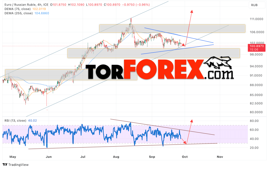 Дополнительным сигнальном в пользу роста валютной пары EUR/RUB на Форекс выступит тест линии линии поддержки на индикаторе относительной силы (RSI). Вторым сигналом станет отскок от нижней границы модели «Треугольник». Отменой варианта роста валютной пары EUR/RUB на Форекс 28 сентября 2023 станет падение и пробой уровня 98.05 Евро за Рубль. Это укажет на пробой области поддержки и продолжение падения пары Евро Рубль в область ниже уровня 94.65. Подтверждением росту валютной пары выступит пробой области сопротивления и закрытие котировок инструмента выше уровня 106.05, что укажет на пробой верхней границы модели «Треугольник» и начало отработки паттерна с целями вверху.