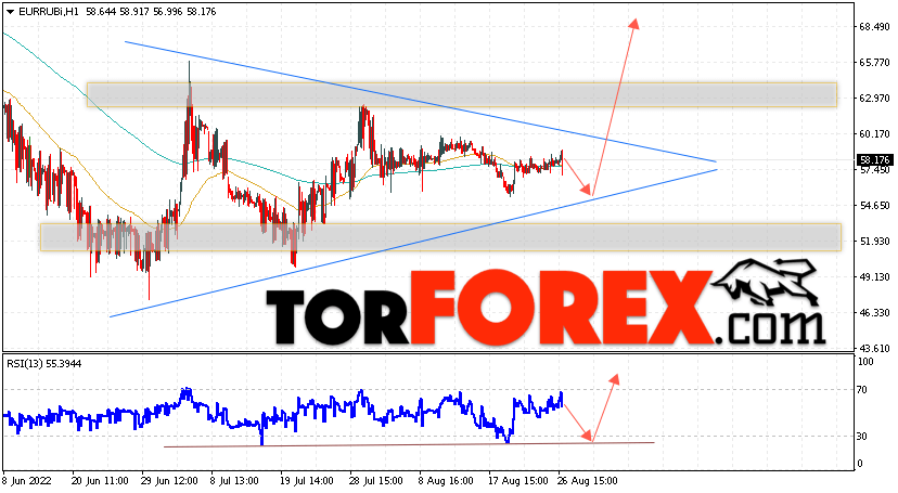 Дополнительным сигнальном в пользу роста валютной пары EUR/RUB на Форекс выступит тест линии линии поддержки на индикаторе относительной силы (RSI). Вторым сигналом станет отскок от нижней границы модели ”Треугольник”. Отменой варианта подъёма валютной пары EUR/RUB на Форекс 29 августа 2022 станет падение и пробой уровня 51.35 Евро за Рубль. Это укажет на пробой области поддержки и продолжение падения пары Евро Рубль в область ниже уровня 46.85. Подтверждением росту валютной пары выступит пробой области сопротивления и закрытие котировок инструмента выше уровня 62.95, что укажет на пробой верхней границы модели ”Треугольник” и начало отработки паттерна с целями вверху.