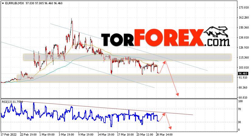 Дополнительным сигнальном в пользу падения валютной пары EUR/RUB на Форекс выступит тест линии сопротивления на индикаторе относительной силы (RSI). Вторым сигналом станет отскок от верхней границы нисходящего канала. Отменой варианта падения валютной пары EUR/RUB на Форекс 29 марта 2022 станет сильный рост и пробой уровня 125.05 Евро за Рубль. Это укажет на пробой области сопротивления и продолжение роста пары Евро Рубль в область выше уровня 135.05. Подтверждением падению валютной пары выступит пробой области поддержки и закрытие котировок инструмента под уровнем 91.55.