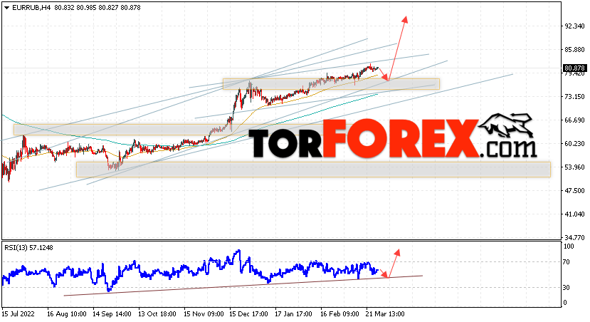 Дополнительным сигнальном в пользу подъёма валютной пары EUR/RUB на Форекс выступит тест линии линии поддержки на индикаторе относительной силы (RSI). Вторым сигналом станет отскок от нижней границы бычьего канала. Отменой варианта роста валютной пары EUR/RUB на Форекс 29 марта 2023 станет падение и пробой уровня 73.05 Евро за Рубль. Это укажет на пробой области поддержки и продолжение снижения пары Евро Рубль в область ниже уровня 68.05. Подтверждением росту валютной пары выступит пробой области сопротивления и закрытие котировок инструмента выше уровня 85.45, что укажет на пробой верхней границы бычьего канала, а это сигнал к росту на ширину канала.