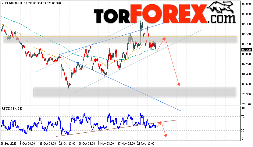 Дополнительным сигнальном в пользу снижения валютной пары EUR/RUB на Форекс выступит тест нисходящей линии тренда на индикаторе относительной силы (RSI). Вторым сигналом станет отскок от верхней границы модели ”Голова и плечи”. Отменой варианта падения валютной пары EUR/RUB на Форекс 3 декабря 2021 станет сильный рост и пробой уровня 86.75 Евро за Рубль. Это укажет на пробой области сопротивления и продолжение подъёма пары Евро Рубль в область выше уровня 89.55. Подтверждением падения валютной пары выступит пробой области поддержки и закрытие котировок инструмента под уровнем 82.75, что укажет на пробой нижней границы модели ”Голова и плечи”.