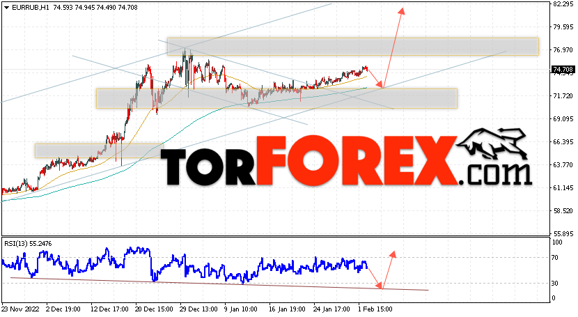 Дополнительным сигнальном в пользу подъёма валютной пары EUR/RUB на Форекс выступит тест линии линии поддержки на индикаторе относительной силы (RSI). Вторым сигналом станет отскок от верхней границы нисходящего канала. Отменой варианта роста валютной пары EUR/RUB на Форекс 3 февраля 2023 станет падение и пробой уровня 68.65 Евро за Рубль. Это укажет на пробой области поддержки и продолжение снижения пары Евро Рубль в область ниже уровня 64.45. Подтверждением росту валютной пары выступит пробой области сопротивления и закрытие котировок инструмента выше уровня 76.35.