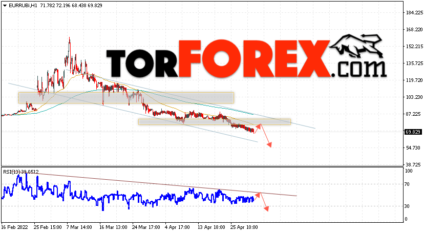 Дополнительным сигнальном в пользу падения валютной пары EUR/RUB на Форекс выступит тест линии сопротивления на индикаторе относительной силы (RSI). Вторым сигналом станет отскок от верхней границы медвежьего канала. Отменой варианта падения валютной пары EUR/RUB на Форекс 3 мая 2022 станет сильный рост и пробой уровня 89.05 Евро за Рубль. Это укажет на пробой области сопротивления и продолжение роста пары Евро Рубль в область выше уровня 95.05. Подтверждением падению валютной пары выступит пробой области поддержки и закрытие котировок инструмента под уровнем 67.05.
