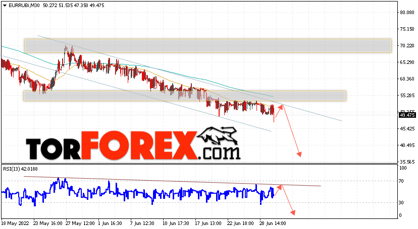 Дополнительным сигнальном в пользу падения валютной пары EUR/RUB на Форекс выступит тест линии линии сопротивления на индикаторе относительной силы (RSI). Вторым сигналом станет отскок от верхней границы медвежьего канала. Отменой варианта падения валютной пары EUR/RUB на Форекс 30 июня 2022 станет сильный рост и пробой уровня 56.25 Евро за Рубль. Это укажет на пробой области сопротивления и продолжение подъёма пары Евро Рубль в область выше уровня 59.45. Подтверждением падению валютной пары выступит пробой области поддержки и закрытие котировок инструмента ниже уровня 44.25.