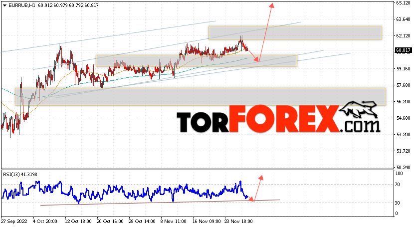 Дополнительным сигнальном в пользу подъёма валютной пары EUR/RUB на Форекс выступит тест линии линии поддержки на индикаторе относительной силы (RSI). Вторым сигналом станет отскок от нижней границы бычьего канала. Отменой варианта роста валютной пары EUR/RUB на Форекс 30 ноября 2022 станет падение и пробой уровня 57.65 Евро за Рубль. Это укажет на пробой области поддержки и продолжение снижения пары Евро Рубль в область ниже уровня 53.25. Подтверждением росту валютной пары выступит пробой области сопротивления и закрытие котировок инструмента выше уровня 63.65, что укажет на пробой верхней границы бычьего канала, а это сигнал к росту на ширину канала.