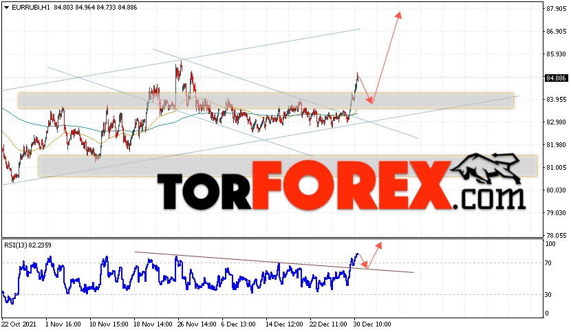 Дополнительным сигнальном в пользу роста валютной пары EUR/RUB на Форекс выступит тест линии тренда на индикаторе относительной силы (RSI). Вторым сигналом станет отскок от нижней границы бычьего канала. Отменой варианта подъёма валютной пары EUR/RUB на Форекс 31 декабря 2021 станет падение и пробой уровня 82.05 Евро за Рубль. Это укажет на пробой области поддержки и продолжение падения пары Евро Рубль в область ниже уровня 80.05. Подтверждением подъёма валютной пары выступит пробой области сопротивления и закрытие котировок инструмента над уровнем 85.55.