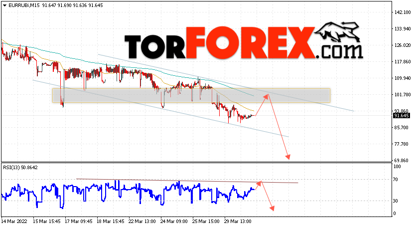 Дополнительным сигнальном в пользу падения валютной пары EUR/RUB на Форекс выступит тест линии сопротивления на индикаторе относительной силы (RSI). Вторым сигналом станет отскок от верхней границы нисходящего канала. Отменой варианта падения валютной пары EUR/RUB на Форекс 31 марта 2022 станет сильный рост и пробой уровня 110.05 Евро за Рубль. Это укажет на пробой области сопротивления и продолжение роста пары Евро Рубль в область выше уровня 125.05. Подтверждением падению валютной пары выступит пробой области поддержки и закрытие котировок инструмента под уровнем 85.05.
