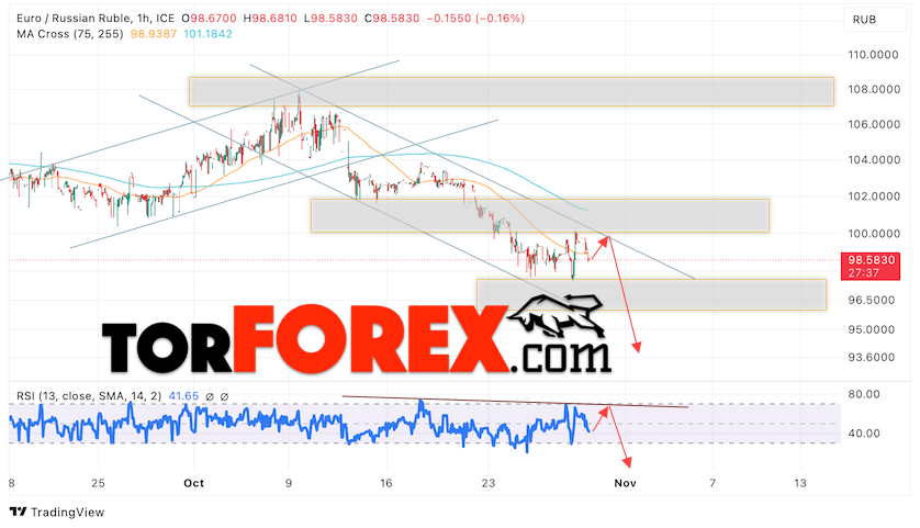 Дополнительным сигнальном в пользу падения валютной пары EUR/RUB на Форекс выступит тест линии линии сопротивления на индикаторе относительной силы (RSI). Вторым сигналом станет отскок от верхней границы медвежьего канала. Отменой варианта падения валютной пары EUR/RUB на Форекс 31 октября 2023 станет сильный рост и пробой уровня 102.25 Евро за Рубль. Это укажет на пробой области поддержки и продолжение падения пары Евро Рубль в область выше уровня 105.45. Подтверждением падению валютной пары выступит пробой области поддержки и закрытие котировок инструмента ниже уровня 96.05.