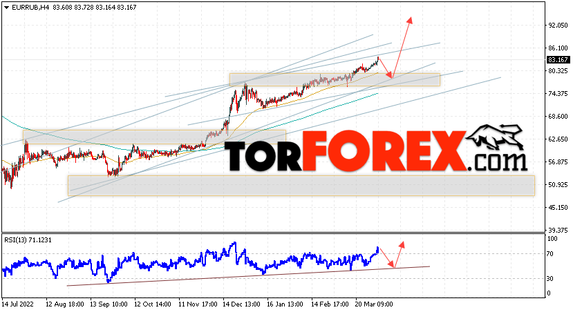 Дополнительным сигнальном в пользу подъёма валютной пары EUR/RUB на Форекс выступит тест линии линии поддержки на индикаторе относительной силы (RSI). Вторым сигналом станет отскок от нижней границы бычьего канала. Отменой варианта роста валютной пары EUR/RUB на Форекс 4 апреля 2023 станет падение и пробой уровня 74.35 Евро за Рубль. Это укажет на пробой области поддержки и продолжение снижения пары Евро Рубль в область ниже уровня 67.25. Подтверждением росту валютной пары выступит пробой области сопротивления и закрытие котировок инструмента выше уровня 86.85, что укажет на пробой верхней границы бычьего канала, а это сигнал к росту на ширину канала.