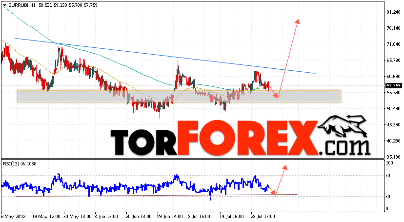Дополнительным сигнальном в пользу роста валютной пары EUR/RUB на Форекс выступит тест линии линии поддержки на индикаторе относительной силы (RSI). Вторым сигналом станет отскок от нижней границы разворотной модели ”Голова и плечи”. Отменой варианта подъёма валютной пары EUR/RUB на Форекс 4 августа 2022 станет падение и пробой уровня 47.05 Евро за Рубль. Это укажет на пробой области поддержки и продолжение падения пары Евро Рубль в область ниже уровня 40.65. Подтверждением росту валютной пары выступит пробой области сопротивления и закрытие котировок инструмента выше уровня 65.85, что укажет на завершение формирования разворотной модели ”Голова и плечи” и начало отработки паттерна.