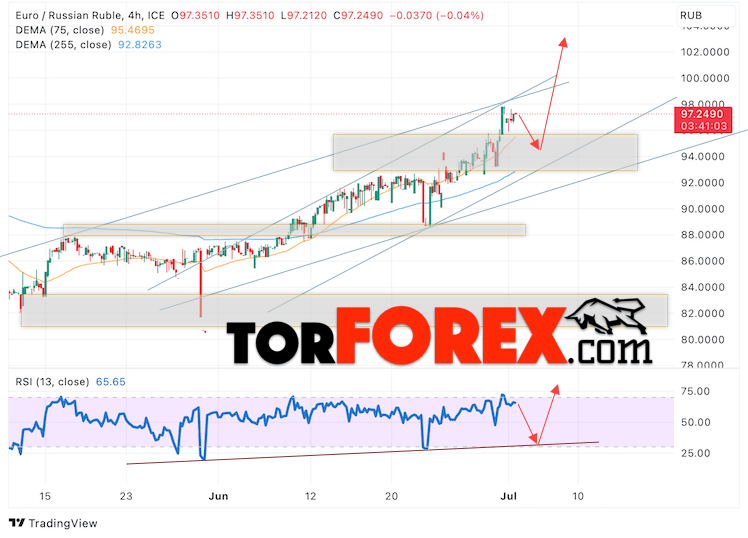 Дополнительным сигнальном в пользу подъёма валютной пары EUR/RUB на Форекс выступит тест линии линии поддержки на индикаторе относительной силы (RSI). Вторым сигналом станет отскок от нижней границы бычьего канала. Отменой варианта роста валютной пары EUR/RUB на Форекс 4 июля 2023 станет падение и пробой уровня 90.05 Евро за Рубль. Это укажет на пробой области поддержки и продолжение падения пары Евро Рубль в область ниже уровня 86.65. Подтверждением росту валютной пары выступит пробой области сопротивления и закрытие котировок инструмента выше уровня 99.65, что укажет на пробой верхней границы бычьего канала, а это сигнал к росту на ширину канала.