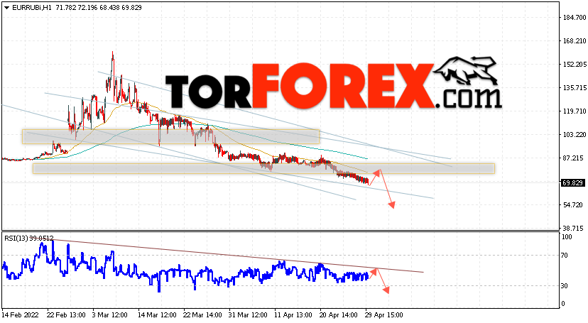 Дополнительным сигнальном в пользу падения валютной пары EUR/RUB на Форекс выступит тест линии сопротивления на индикаторе относительной силы (RSI). Вторым сигналом станет отскок от верхней границы медвежьего канала. Отменой варианта падения валютной пары EUR/RUB на Форекс 4 мая 2022 станет сильный рост и пробой уровня 89.05 Евро за Рубль. Это укажет на пробой области сопротивления и продолжение роста пары Евро Рубль в область выше уровня 95.05. Подтверждением падению валютной пары выступит пробой области поддержки и закрытие котировок инструмента под уровнем 65.55.