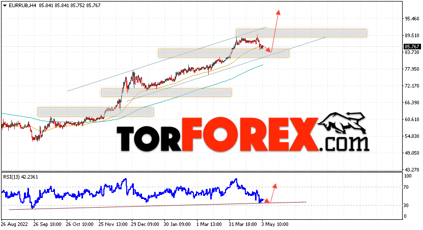 Дополнительным сигнальном в пользу подъёма валютной пары EUR/RUB на Форекс выступит тест линии линии поддержки на индикаторе относительной силы (RSI). Вторым сигналом станет отскок от нижней границы бычьего канала. Отменой варианта роста валютной пары EUR/RUB на Форекс 4 мая 2023 станет падение и пробой уровня 82.05 Евро за Рубль. Это укажет на пробой области поддержки и продолжение снижения пары Евро Рубль в область ниже уровня 73.45. Подтверждением росту валютной пары выступит пробой области сопротивления и закрытие котировок инструмента выше уровня 90.05.
