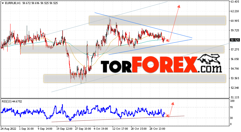 Дополнительным сигнальном в пользу подъёма валютной пары EUR/RUB на Форекс выступит тест линии линии поддержки на индикаторе относительной силы (RSI). Вторым сигналом станет отскок от нижней границы модели ”Треугольник”. Отменой варианта роста валютной пары EUR/RUB на Форекс 4 ноября 2022 станет падение и пробой уровня 56.25 Евро за Рубль. Это укажет на пробой области поддержки и продолжение снижения пары Евро Рубль в область ниже уровня 52.65. Подтверждением росту валютной пары выступит пробой области сопротивления и закрытие котировок инструмента выше уровня 61.05, что укажет на пробой верхней границы модели ”Треугольник” и начало отработки паттерна с целью вверху.