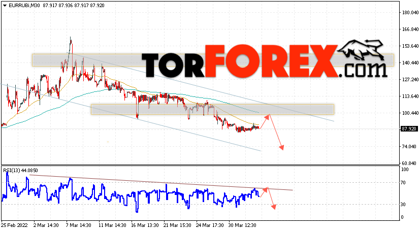 Дополнительным сигнальном в пользу падения валютной пары EUR/RUB на Форекс выступит тест линии сопротивления на индикаторе относительной силы (RSI). Вторым сигналом станет отскок от верхней границы нисходящего канала. Отменой варианта падения валютной пары EUR/RUB на Форекс 5 апреля 2022 станет сильный рост и пробой уровня 107.55 Евро за Рубль. Это укажет на пробой области сопротивления и продолжение роста пары Евро Рубль в область выше уровня 115.05. Подтверждением падению валютной пары выступит пробой области поддержки и закрытие котировок инструмента под уровнем 85.05.