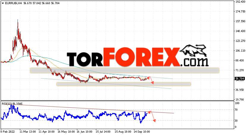 Дополнительным сигнальном в пользу падения валютной пары EUR/RUB на Форекс выступит тест линии линии сопротивления на индикаторе относительной силы (RSI). Вторым сигналом станет отскок от верхней границы нисходящего канала. Отменой варианта падения валютной пары EUR/RUB на Форекс 5 октября 2022 станет сильный рост и пробой уровня 59.65 Евро за Рубль. Это укажет на пробой области сопротивления и продолжение роста пары Евро Рубль в область выше уровня 63.75. Подтверждением падению валютной пары выступит пробой области поддержки и закрытие котировок инструмента ниже уровня 52.05.