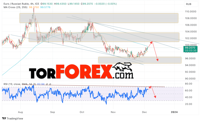 Дополнительным сигнальном в пользу падения валютной пары EUR/RUB на Форекс выступит тест линии линии сопротивления на индикаторе относительной силы (RSI). Вторым сигналом станет отскок от верхней границы нисходящего канала. Отменой варианта падения валютной пары EUR/RUB на Форекс 6 декабря 2023 станет сильный рост и пробой уровня 103.75 Евро за Рубль. Это укажет на пробой области сопротивления и продолжение роста пары Евро Рубль в область выше уровня 105.65. Подтверждением падению валютной пары выступит пробой области поддержки и закрытие котировок инструмента ниже уровня 97.35.