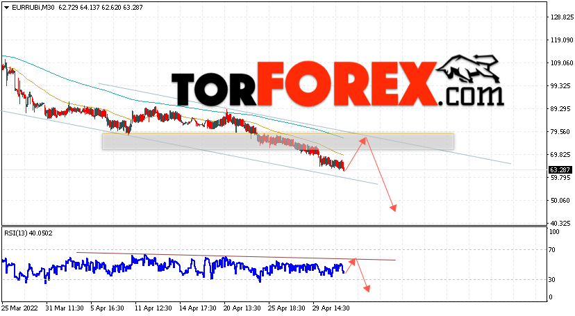 Дополнительным сигнальном в пользу падения валютной пары EUR/RUB на Форекс выступит тест линии сопротивления на индикаторе относительной силы (RSI). Вторым сигналом станет отскок от верхней границы медвежьего канала. Отменой варианта падения валютной пары EUR/RUB на Форекс 6 мая 2022 станет сильный рост и пробой уровня 82.05 Евро за Рубль. Это укажет на пробой области сопротивления и продолжение роста пары Евро Рубль в область выше уровня 92.55. Подтверждением падению валютной пары выступит пробой области поддержки и закрытие котировок инструмента под уровнем 58.05.