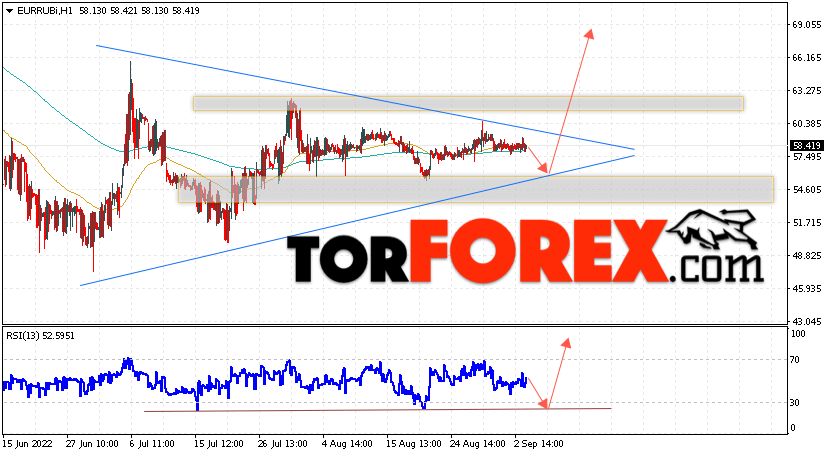 Дополнительным сигнальном в пользу роста валютной пары EUR/RUB на Форекс выступит тест линии линии поддержки на индикаторе относительной силы (RSI). Вторым сигналом станет отскок от нижней границы модели ”Треугольник”. Отменой варианта подъёма валютной пары EUR/RUB на Форекс 6 сентября 2022 станет падение и пробой уровня 51.55 Евро за Рубль. Это укажет на пробой области поддержки и продолжение падения пары Евро Рубль в область ниже уровня 47.65. Подтверждением росту валютной пары выступит пробой области сопротивления и закрытие котировок инструмента выше уровня 61.55, что укажет на пробой верхней границы модели ”Треугольник” и начало отработки паттерна.