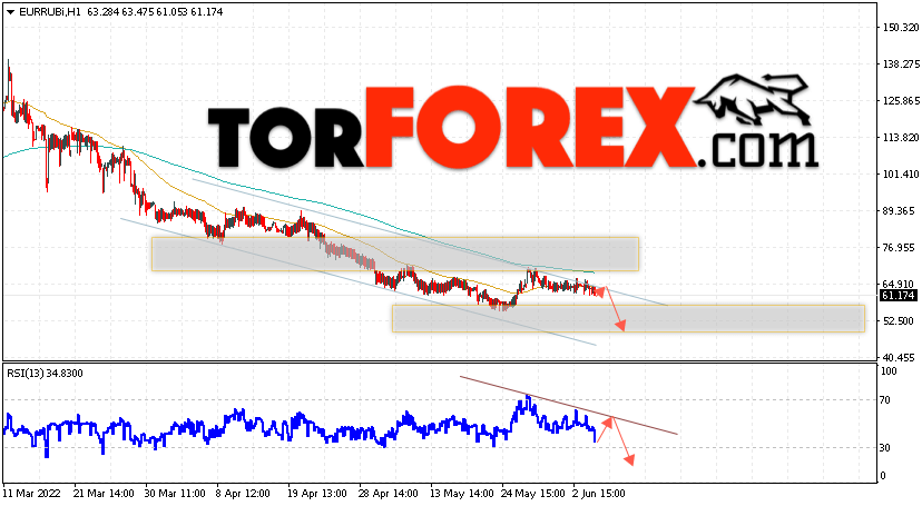 Дополнительным сигнальном в пользу падения валютной пары EUR/RUB на Форекс выступит тест линии линии сопротивления на индикаторе относительной силы (RSI). Вторым сигналом станет отскок от верхней границы медвежьего канала. Отменой варианта падения валютной пары EUR/RUB на Форекс 7 июня 2022 станет сильный рост и пробой уровня 66.35 Евро за Рубль. Это укажет на пробой области сопротивления и продолжение роста пары Евро Рубль в область выше уровня 71.05. Подтверждением падению валютной пары выступит пробой области поддержки и закрытие котировок инструмента ниже уровня 53.05.