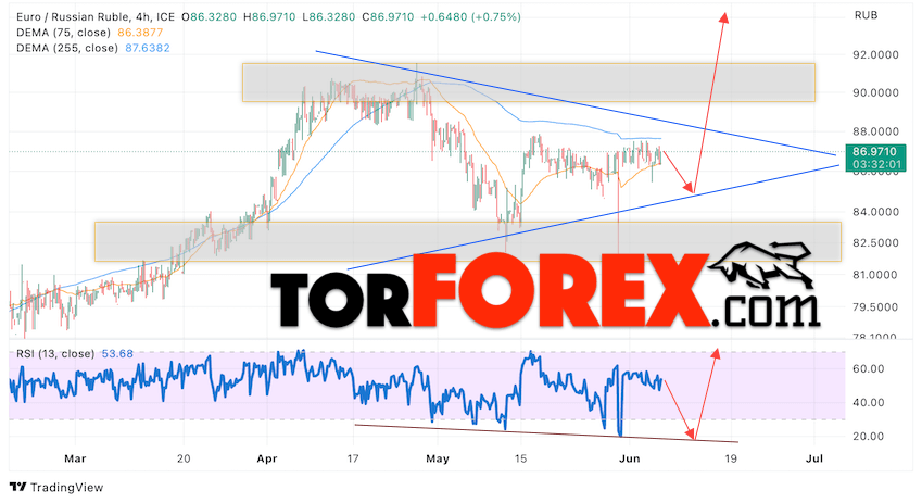 Дополнительным сигнальном в пользу подъёма валютной пары EUR/RUB на Форекс выступит тест линии линии поддержки на индикаторе относительной силы (RSI). Вторым сигналом станет отскок от нижней границы модели «Треугольник». Отменой варианта роста валютной пары EUR/RUB на Форекс 7 июня 2023 станет падение и пробой уровня 83.25 Евро за Рубль. Это укажет на пробой области поддержки и продолжение падения пары Евро Рубль в область ниже уровня 77.85. Подтверждением росту валютной пары выступит пробой области сопротивления и закрытие котировок инструмента выше уровня 90.25, что укажет на пробой верхней границы модели «Треугольник» и начало отработки модели с целями вверху.