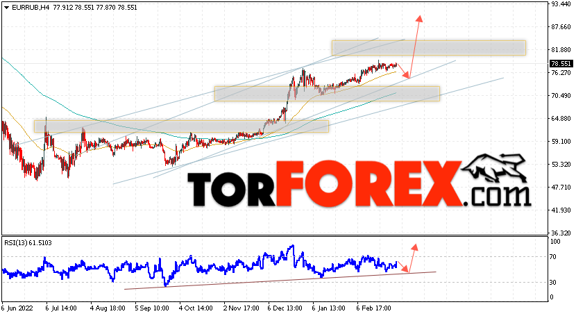 Дополнительным сигнальном в пользу подъёма валютной пары EUR/RUB на Форекс выступит тест линии линии поддержки на индикаторе относительной силы (RSI). Вторым сигналом станет отскок от нижней границы бычьего канала. Отменой варианта роста валютной пары EUR/RUB на Форекс 7 марта 2023 станет падение и пробой уровня 68.05 Евро за Рубль. Это укажет на пробой области поддержки и продолжение снижения пары Евро Рубль в область ниже уровня 64.05. Подтверждением росту валютной пары выступит пробой области сопротивления и закрытие котировок инструмента выше уровня 81.55.