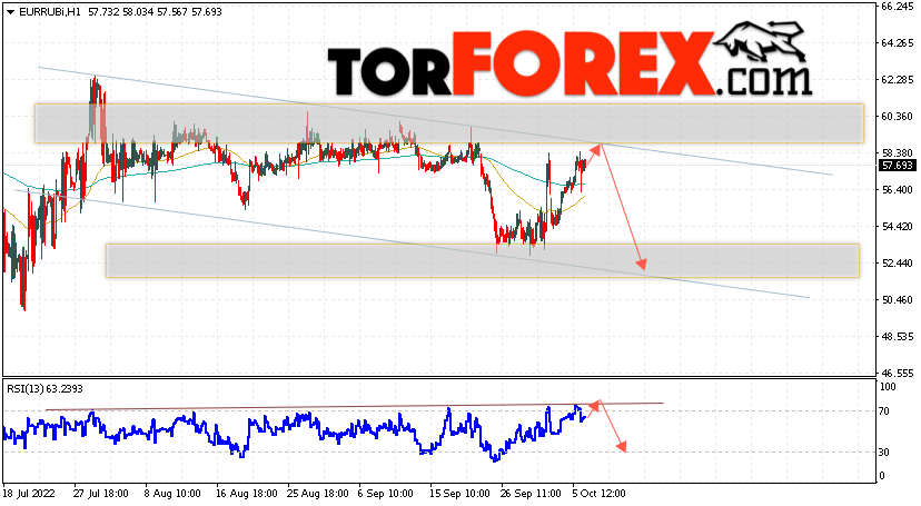 Дополнительным сигнальном в пользу падения валютной пары EUR/RUB на Форекс выступит тест линии линии сопротивления на индикаторе относительной силы (RSI). Вторым сигналом станет отскок от верхней границы нисходящего канала. Отменой варианта падения валютной пары EUR/RUB на Форекс 7 октября 2022 станет сильный рост и пробой уровня 60.55 Евро за Рубль. Это укажет на пробой области сопротивления и продолжение роста пары Евро Рубль в область выше уровня 63.25. Подтверждением падению валютной пары выступит пробой области поддержки и закрытие котировок инструмента ниже уровня 55.05.