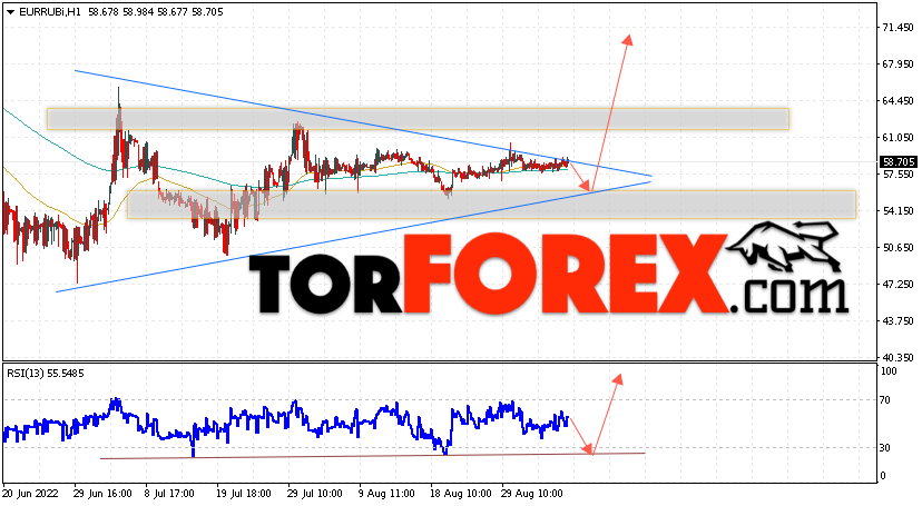 Дополнительным сигнальном в пользу роста валютной пары EUR/RUB на Форекс выступит тест линии линии поддержки на индикаторе относительной силы (RSI). Вторым сигналом станет отскок от нижней границы модели ”Треугольник”. Отменой варианта подъёма валютной пары EUR/RUB на Форекс 7 сентября 2022 станет падение и пробой уровня 52.05 Евро за Рубль. Это укажет на пробой области поддержки и продолжение падения пары Евро Рубль в область ниже уровня 47.95. Подтверждением росту валютной пары выступит пробой области сопротивления и закрытие котировок инструмента выше уровня 61.45, что укажет на пробой верхней границы модели ”Треугольник” и начало отработки паттерна.