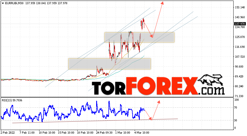 Дополнительным сигнальном в пользу подъёма валютной пары EUR/RUB на Форекс выступит тест линии поддержки на индикаторе относительной силы (RSI). Вторым сигналом станет отскок от нижней границы бычьего канала. Отменой варианта роста валютной пары EUR/RUB на Форекс 8 марта 2022 станет падение и пробой уровня 110.05 Евро за Рубль. Это укажет на пробой области поддержки и продолжение падения пары Евро Рубль в область ниже уровня 85.05. Подтверждением подъёму валютной пары выступит пробой области сопротивления и закрытие котировок инструмента над уровнем 150.05.