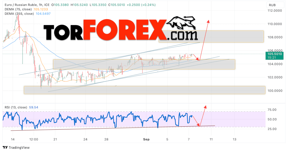 Дополнительным сигнальном в пользу подъёма валютной пары EUR/RUB на Форекс выступит тест линии линии поддержки на индикаторе относительной силы (RSI). Вторым сигналом станет отскок от нижней границы бычьего канала. Отменой варианта роста валютной пары EUR/RUB на Форекс 8 сентября 2023 станет падение и пробой уровня 102.45 Евро за Рубль. Это укажет на пробой области поддержки и продолжение падения пары Евро Рубль в область ниже уровня 97.35. Подтверждением росту валютной пары выступит пробой области сопротивления и закрытие котировок инструмента выше уровня 108.65.