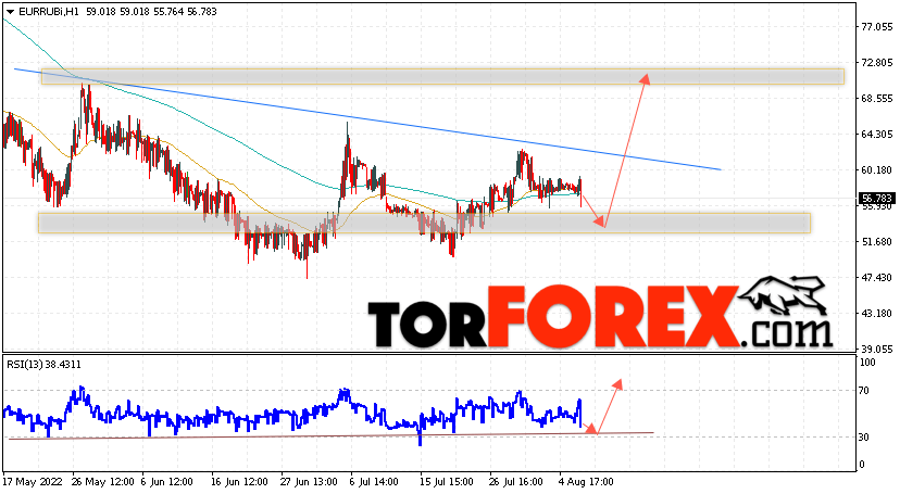 Дополнительным сигнальном в пользу роста валютной пары EUR/RUB на Форекс выступит тест линии линии поддержки на индикаторе относительной силы (RSI). Вторым сигналом станет отскок от нижней границы разворотной модели ”Голова и плечи”. Отменой варианта подъёма валютной пары EUR/RUB на Форекс 9 августа 2022 станет падение и пробой уровня 47.35 Евро за Рубль. Это укажет на пробой области поддержки и продолжение падения пары Евро Рубль в область ниже уровня 41.05. Подтверждением росту валютной пары выступит пробой области сопротивления и закрытие котировок инструмента выше уровня 65.55, что укажет на завершение формирования разворотной модели ”Голова и плечи” и начало отработки паттерна.