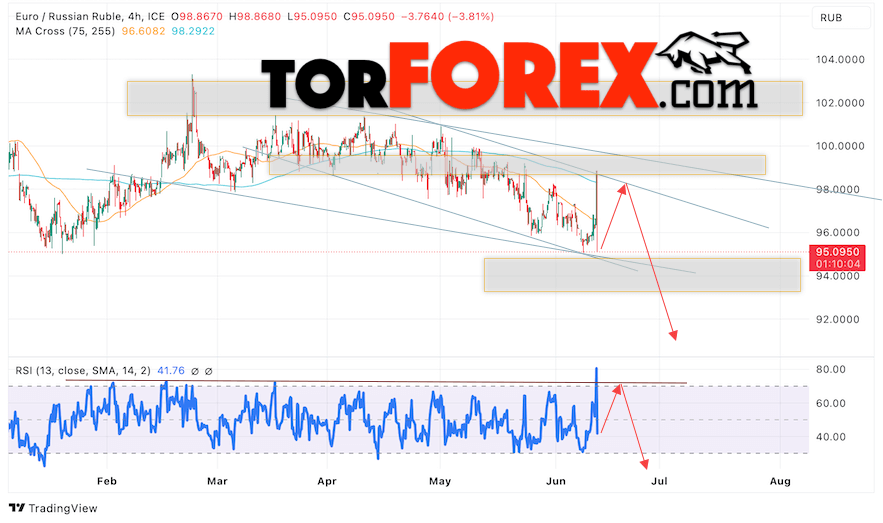 Дополнительным сигнальном в пользу снижения валютной пары EUR/RUB на Форекс выступит тест линии линии сопротивления на индикаторе относительной силы (RSI). Вторым сигналом станет отскок от верхней границы нисходящего канала. Отменой варианта снижения валютной пары EUR/RUB на Форекс 14 июня 2024 станет сильный рост и пробой уровня 99.75 Евро за Рубль. Это укажет на пробой области сопротивления и продолжение роста пары Евро Рубль в область выше уровня 103.55. Подтверждением падению валютной пары выступит пробой области поддержки и закрытие котировок инструмента ниже уровня 93.75, что укажет на пробой нижней границы нисходящего канала.