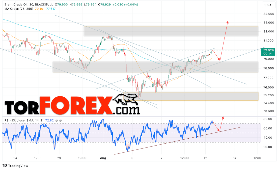 Котировки нефти марки Brent продолжают движение в рамках развития роста и бычьего канала. В момент публикации прогноза цена нефти марки Brent составляет 79.92 долларов за баррель. Скользящие средние указывают на наличие краткосрочной бычьей тенденции по нефти. Цены пробили область между сигнальными линиями вверх, что указывает на давление со стороны покупателей «Черного Золота» и потенциальное продолжение роста стоимости нефти уже с текущих уровней. На данный момент стоит рассматривать попытку развития незначительного падения и тест уровня поддержки вблизи области 79.05 долларов за баррель. Далее, отскок вверх и продолжение роста курса нефти в область выше уровня 72.35.