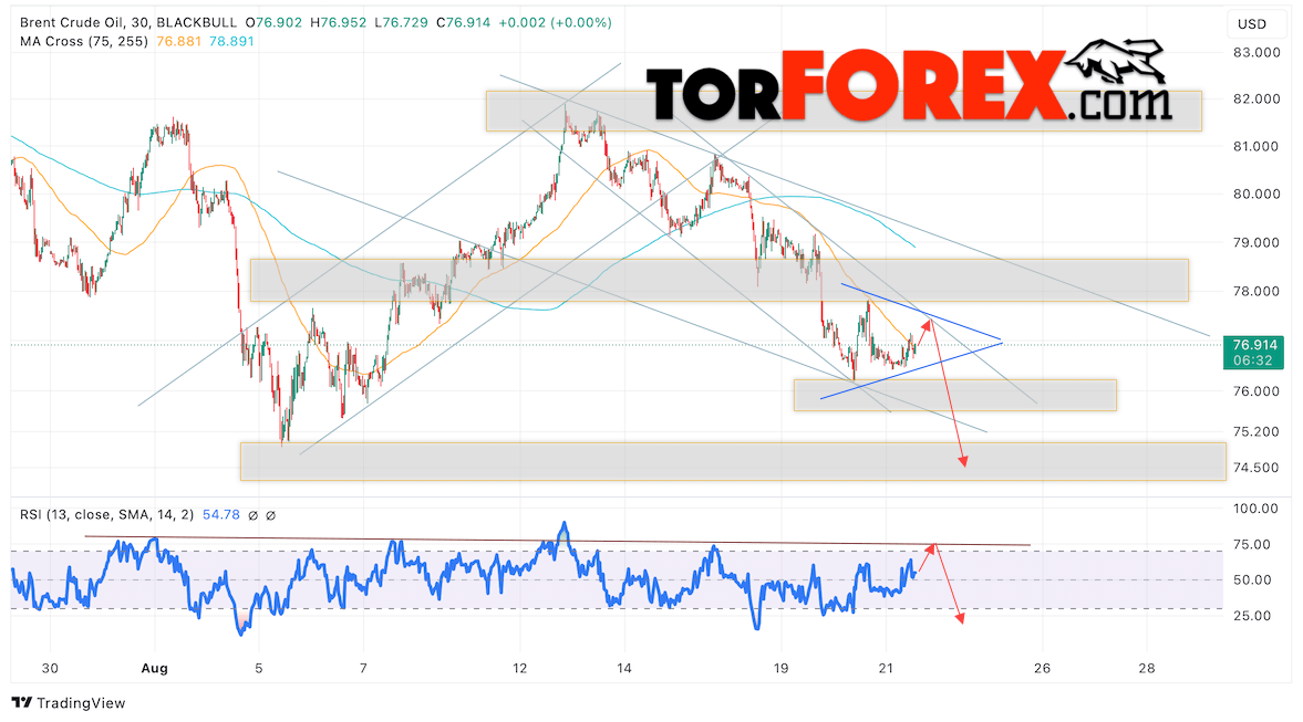 Таким образом, Нефть прогноз цены Brent на 22 августа 2024 предполагает тестирование уровня сопротивления на отметки 77.65 долларов за баррель. Затем, ожидается продолжение падения нефти с целью ниже уровня 74.45. Тест линии тренда на индикаторе относительной силы (RSI) будет подтверждать падение стоимости актива. Альтернативный сценарий, который предполагает рост цены нефти Brent, наступит при пробое уровня 78.75, что укажет на дальнейшее подъём котировок к уровню 84.05.