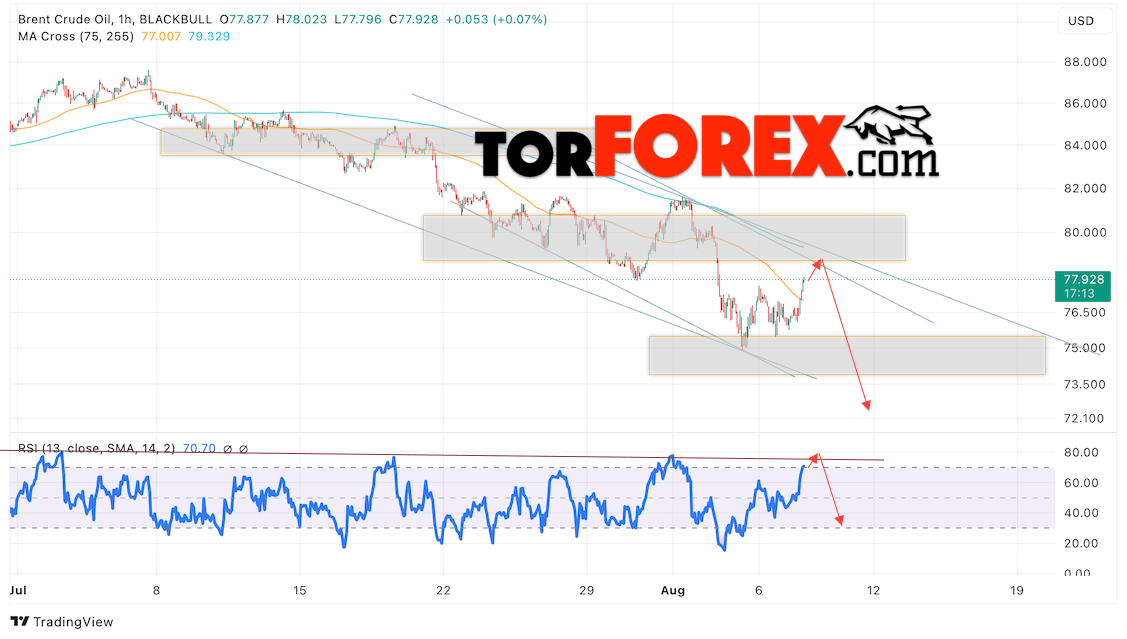Котировки нефти марки Brent продолжают движение в рамках развития падения и нисходящего канала. В момент публикации прогноза цена нефти марки Brent составляет 77.92 долларов за баррель. Скользящие средние указывают на наличие краткосрочной медвежьей тенденции по нефти. Цены вновь тестируют область между сигнальными линиями, что указывает на давление со стороны продавцов «Черного Золота» и потенциальное продолжение падения стоимости нефти уже с текущих уровней. На данный момент стоит рассматривать попытку развития незначительного роста и тест уровня сопротивления вблизи области 79.65 долларов за баррель. Далее, отскок вниз и продолжение падения курса нефти в область ниже уровня 72.15.