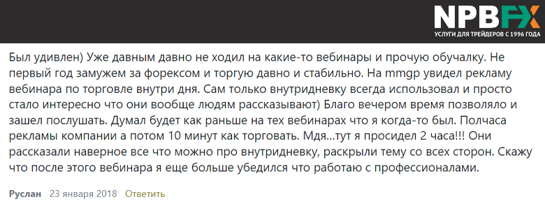 Встречаются отзывы от трейдеров, сосредоточенных в основном на одном инструменте или узкой, но весьма значимой услуге. Например, как здесь – трейдер предпочитает торговлю сырьем и отмечает, что в NPBFX для торговли золотом одни из лучших условий – плечо, приятные свопы. Коротко и емко.