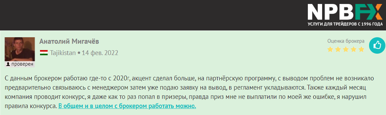 Еще одна тема, которая часто поднимается в отзывах – партнерская программа. Клиентам NPBFX нравится честный подход, возможность зарабатывать даже без прямой торговли. Но трейдер из примера ниже говорит еще об одном моменте – конкурсе на демо «Битва трейдеров», в котором его исключили из числа победителей из-за нарушения правил. Но это подчеркивает в очередной раз приверженность брокера к работе на основе прозрачности и с полным соблюдением правил.