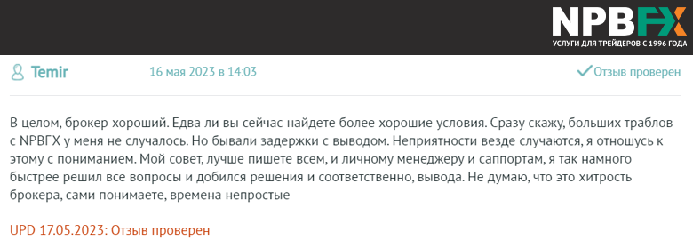Встречаются, конечно, отзывы более нейтральные, с выделением небольших проблем, от которых не застрахована ни одна компания. К примеру, из-за введения санкций и закрытия некоторых способов оплаты, брокеру пришлось экстренно искать другие пути и методы пополнения/вывода – конечно, из-за этого могли возникать проблемы и задержки. Но благодаря решению NPBFX, сейчас клиенты могут продолжать использовать карты для пополнения счета.