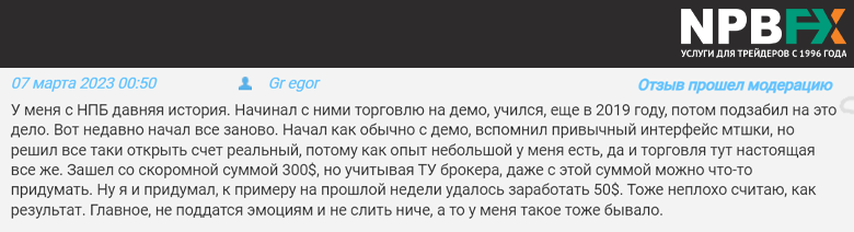 Следующий отзыв – пример того, как трейдеры, сделавшие перерыв в работе на Форекс, возвращаются к ней снова и выбирают все того же брокера из-за его условий и возможностей. Трейдер с ником «Gr egor» отмечает, что пусть за неделю сумма заработка за неделю оказалась сравнительно небольшой – всего $50, но для стартового депозита в $300 это достаточно хороший результат.