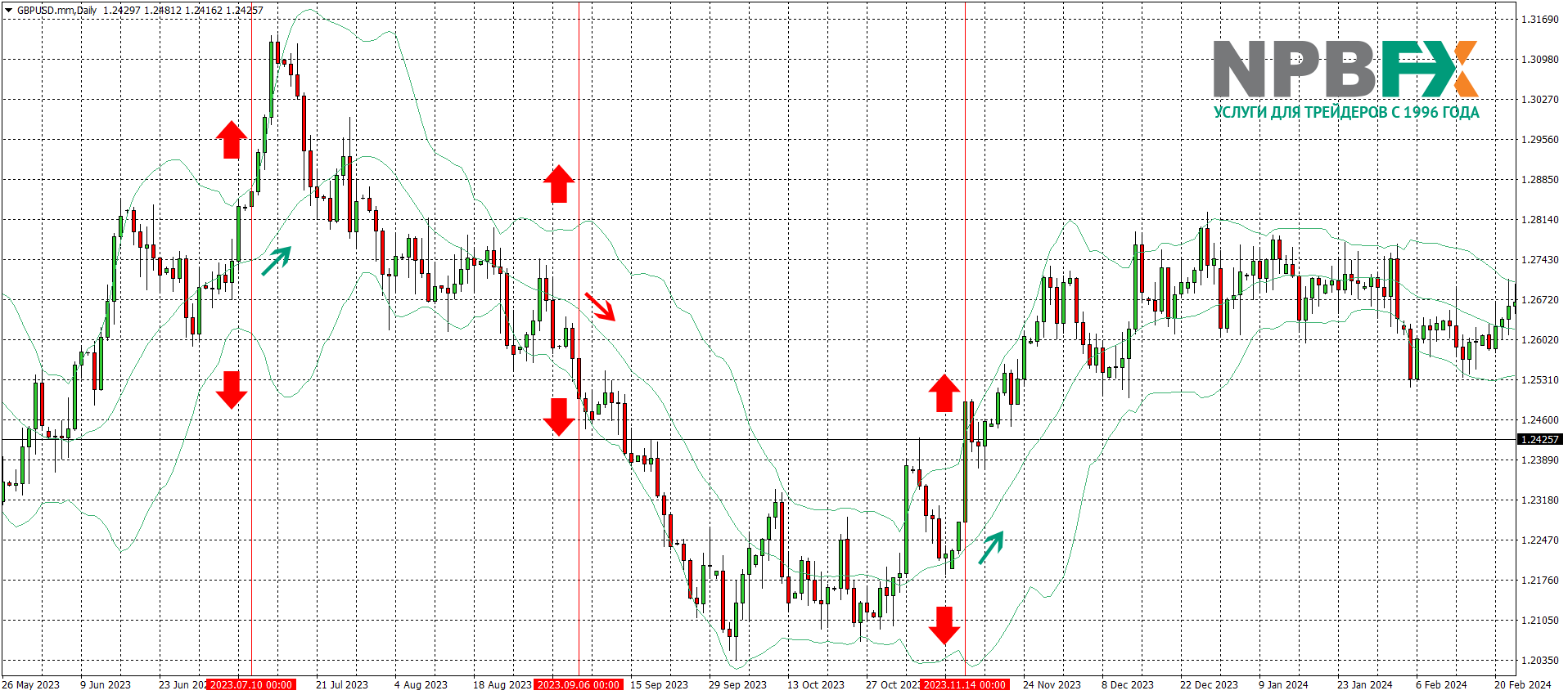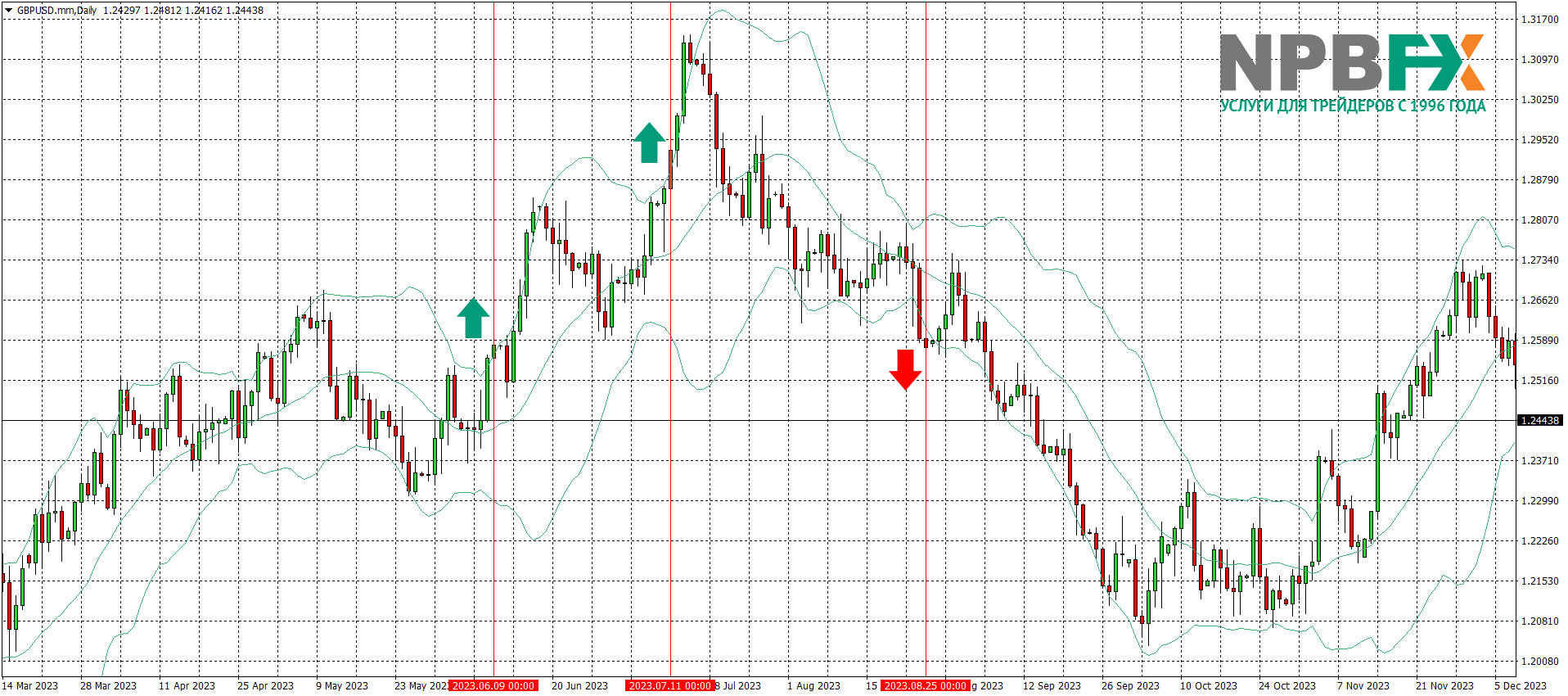 На графике мы выделили вертикальными красными линиями и зелеными стрелками две «бычьи» свечи, которые закрылись выше верхней линии индикатора. Учитывая, что внешние линии расширялись, а средняя имела восходящий уклон, эти показания Bollinger Bands можно было использовать для открытия позиций на покупку. Сделка на продажу открывалась, когда цена двигалась в области нижней линии индикатора, а после закрылась за ее пределами. Эту свечу мы также обозначили красной вертикальной линией и стрелкой. Наибольший профит трейдер получил бы, открыв самую первую сделку на покупку, а после на продажу. Вторая сделка на покупку была бы открыта на завершающей фазе восходящего тренда, соответственно, с меньшей прибылью.